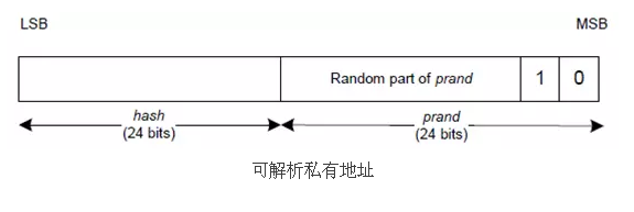 假设有两个蓝牙设备,分别是设备A和设备B,在两个蓝牙设备A、B建立连接之后,这两个蓝牙设备可以通过配对的方式交换各自的身份解析密钥IRK(Identity Resolving Key, IRK),设备A的身份解析密钥IRK-A,设备B的身份解析密钥IRK-B。假设设备B采用了可解析的私有地址机制,那么设备B就需要周期性的产生可解析的私有地址。下图是可解析随机地址的结构,其中可解析随机地址的高两个比特分别为0和1,作为可解析地址的标识符。 当设备B需要生成随机地址的时候,其内部会首先生成一个随机数prand,基于prand随机数,设备B需要利用哈希hash算法生成可解析随机地址的另外一部分,hash。prand随机数和哈希hash分别占用24比特,计算公式为:
